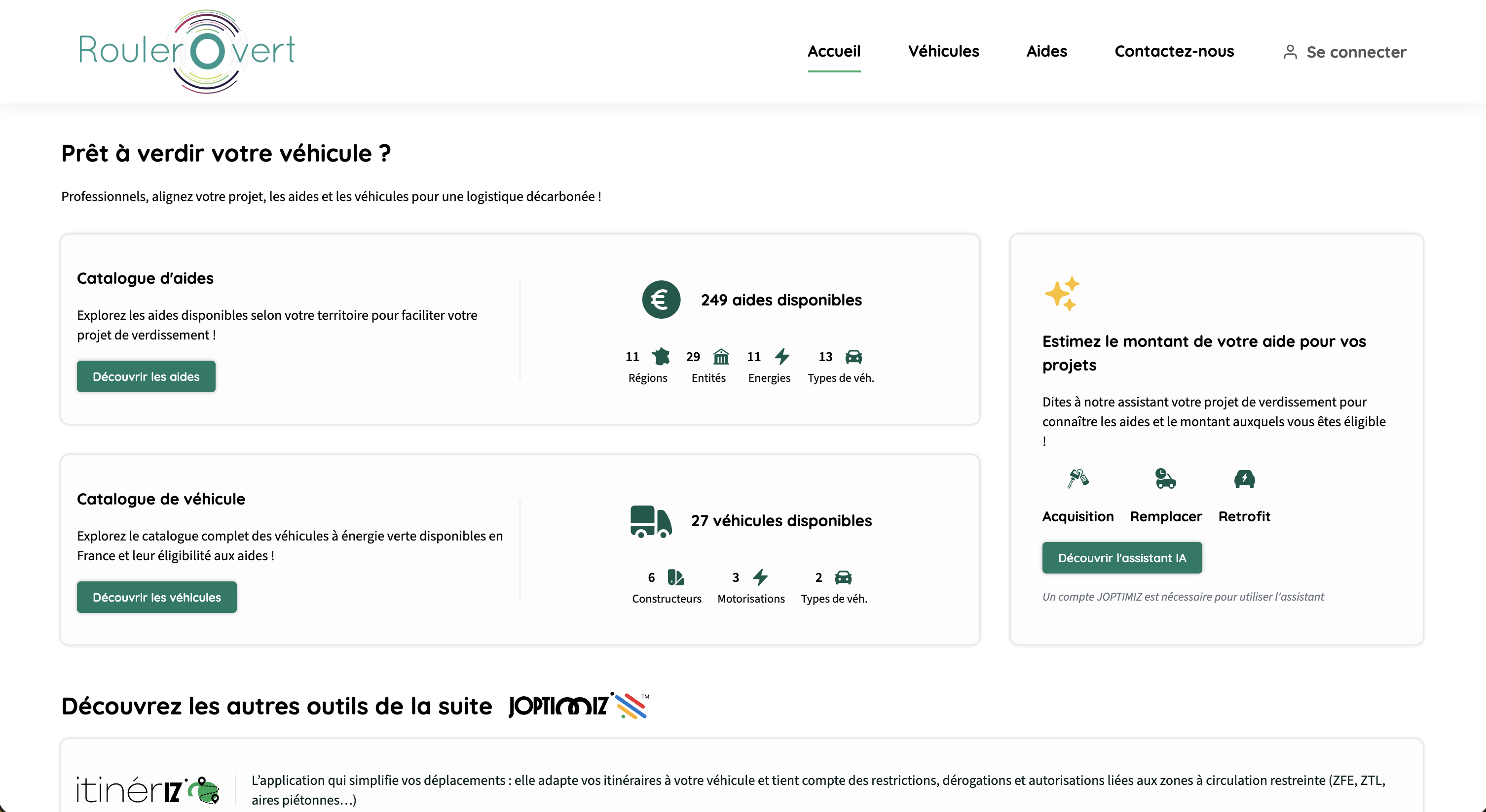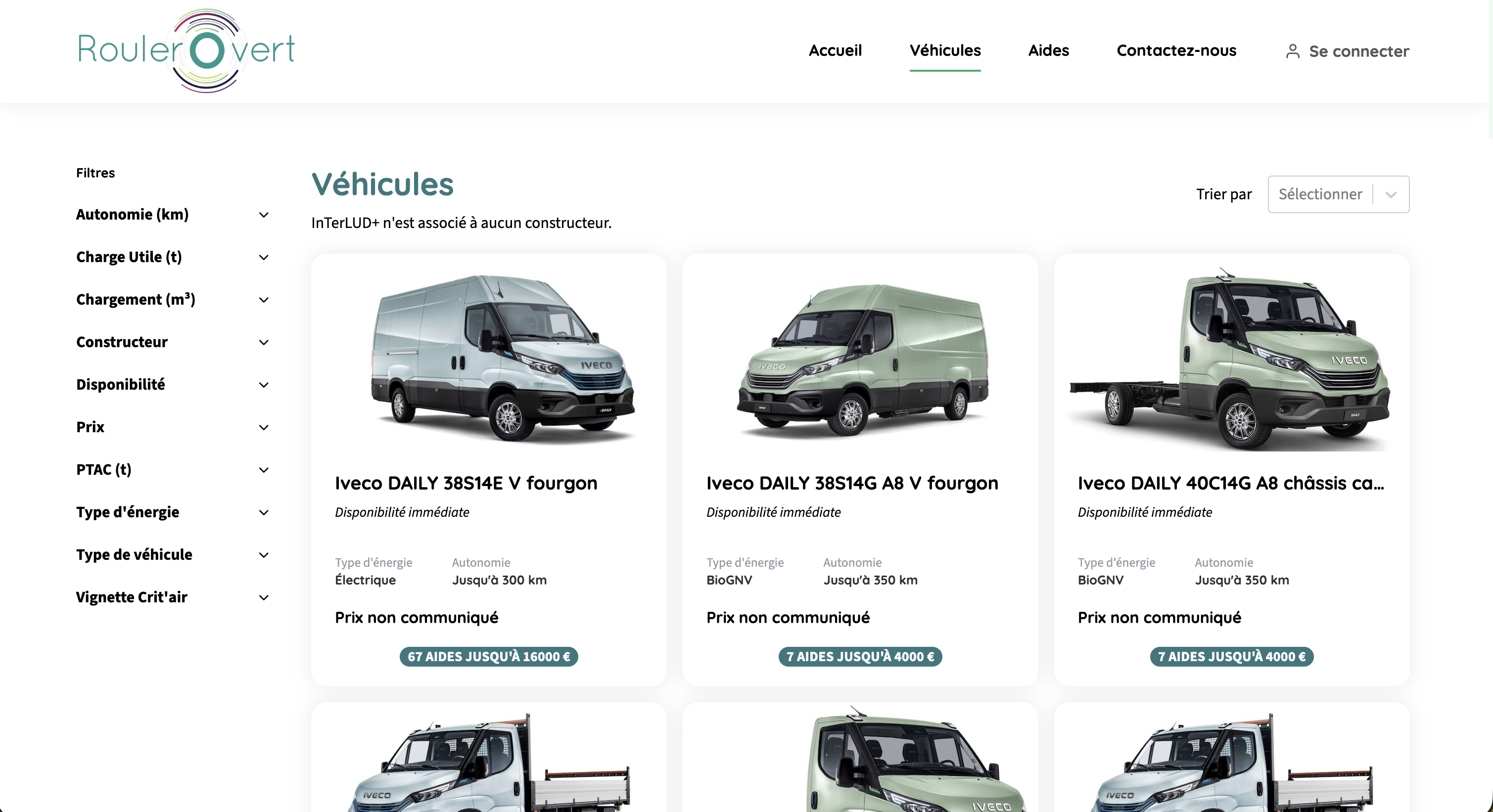 RoulerOvert (rouler-o-vert.green) est une plateforme web d’accompagnement au verdissement des flottes de véhicules. Elle fait partie des produits numériques d’intérêt général développés par le Programme InTerLUD+, qui viennent appuyer et renforcer l’impact des programmes de concertation entre collectivités et acteurs publics en faveur d’une logistique urbaine durable.
