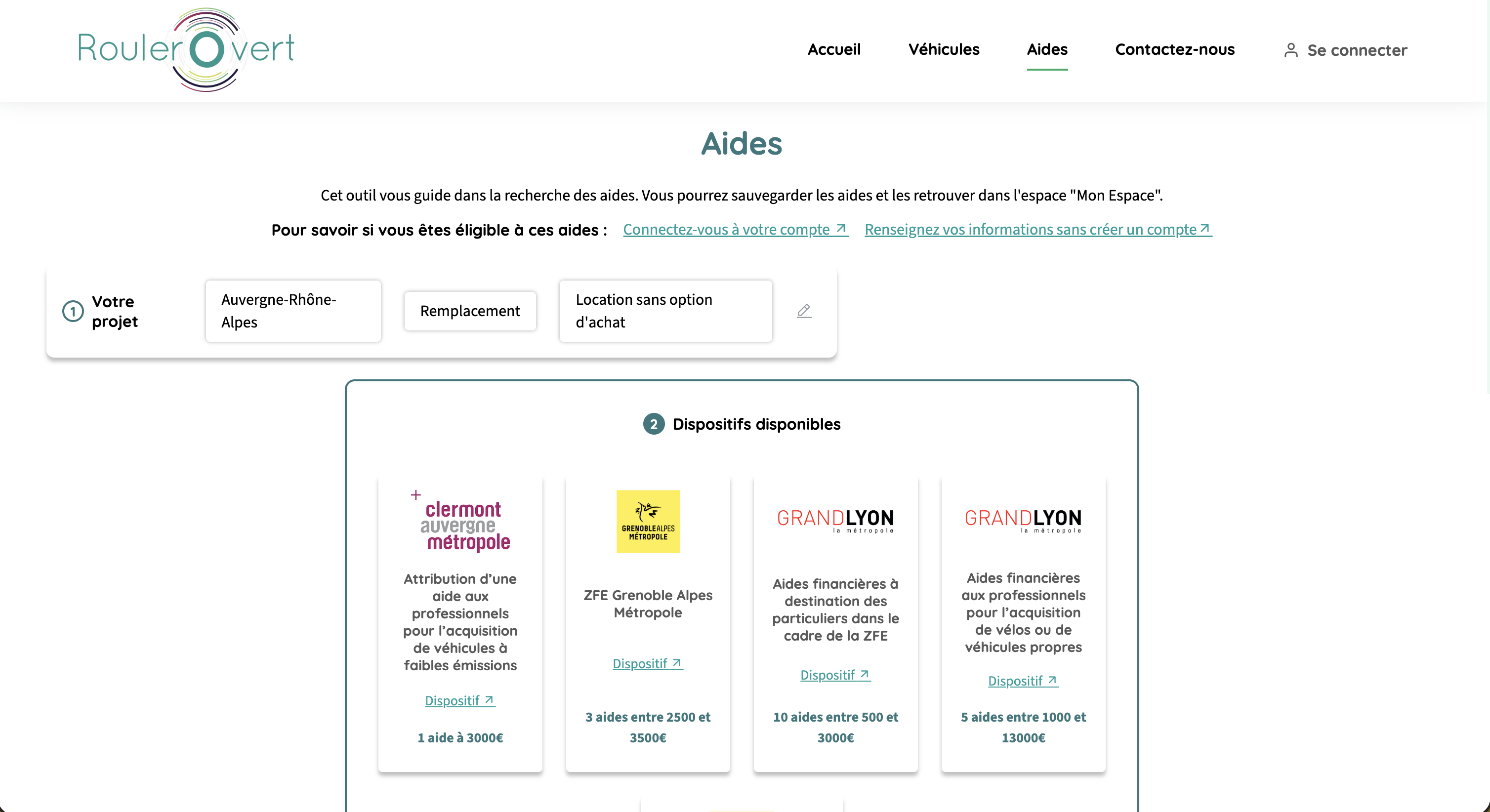 Les premières versions de RoulerOvert se sont concentrées sur la présentation et la navigation simple dans l’exhaustivité des aides disponibles et sur les critères de matching entre les projets et le profil de l’utilisateur.