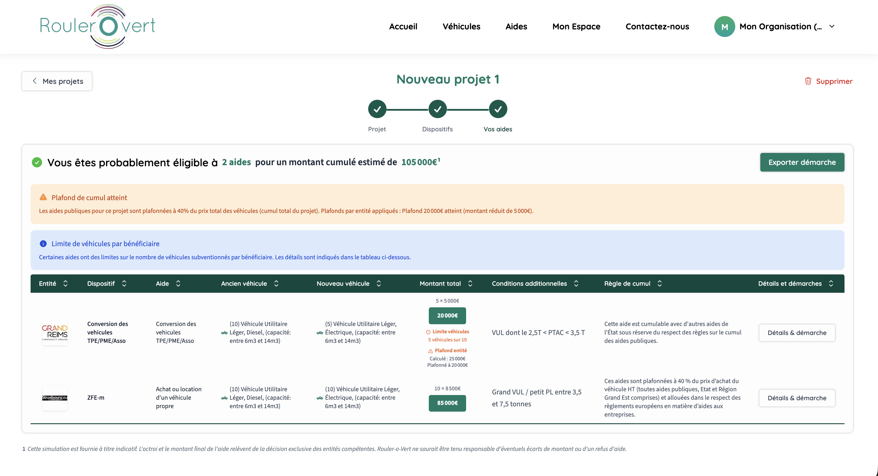 Cette première version manquait d’un véritable module de simulation de projet de verdissement permettant de modéliser complètement un projet (flotte d’origine → leviers utilisés (achat, remplacement, location, rétrofit) → flotte d’arrivée) et de connaître précisément les aides éligibles et leur montant cumulé.